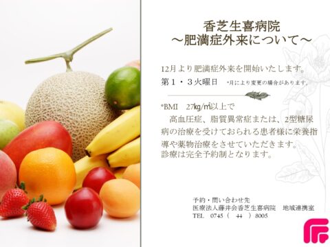 ・BMI 27kg/㎥以上で ・高血圧症・脂質異常症または2型糖尿病の治療を受けておられる患者様 を対象に、栄養指導や薬物治療をさせていただきます。完全予約制となります。