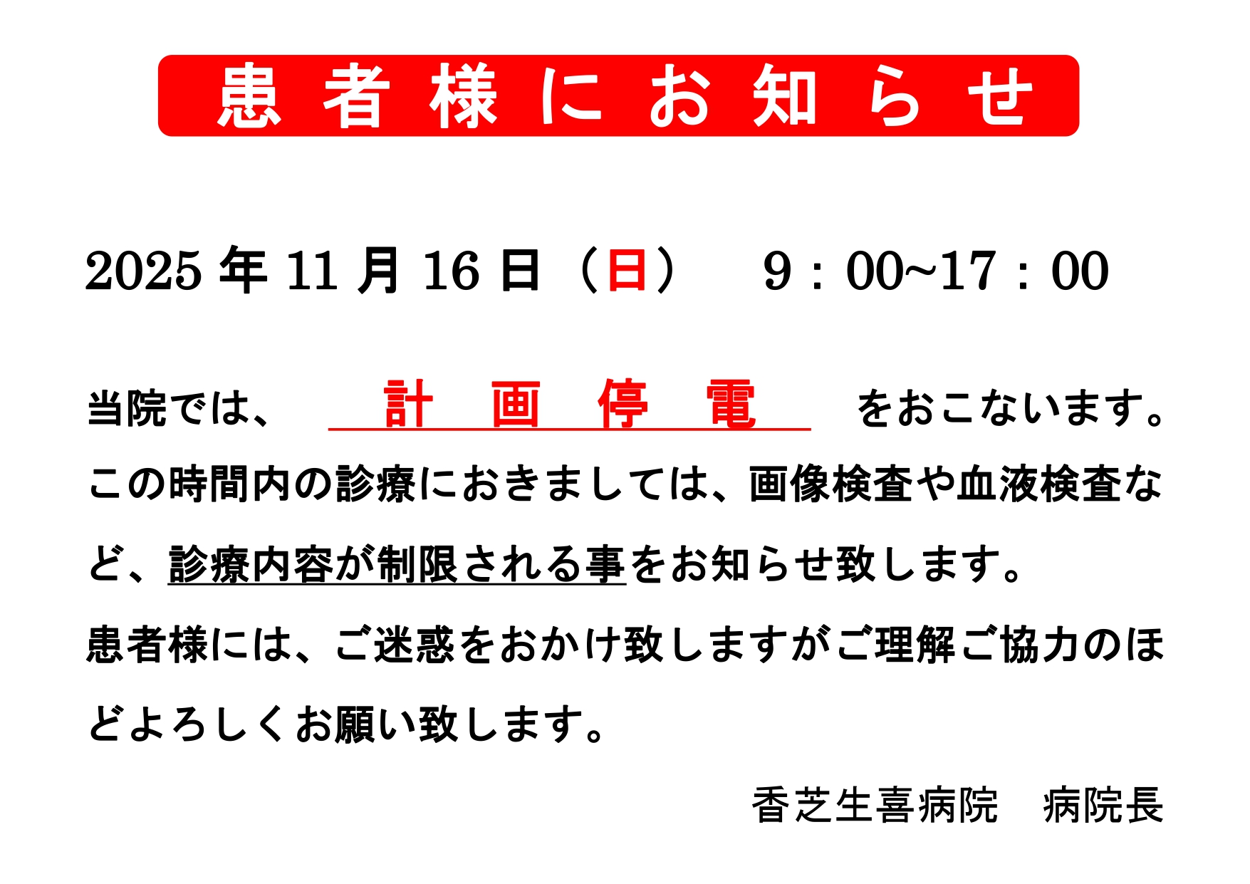【患者さまへ】11月16日(日)計画停電のお知らせ